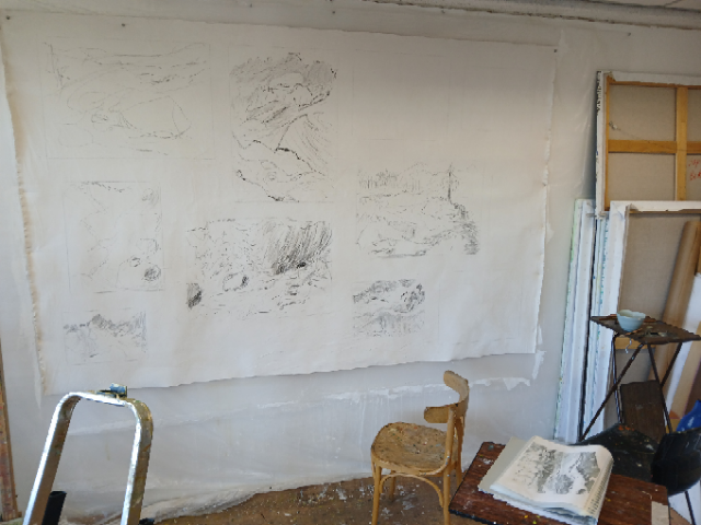 Tekeningen op groot doek, als voorbereiding op nieuwe composities op formaat 220-330 !