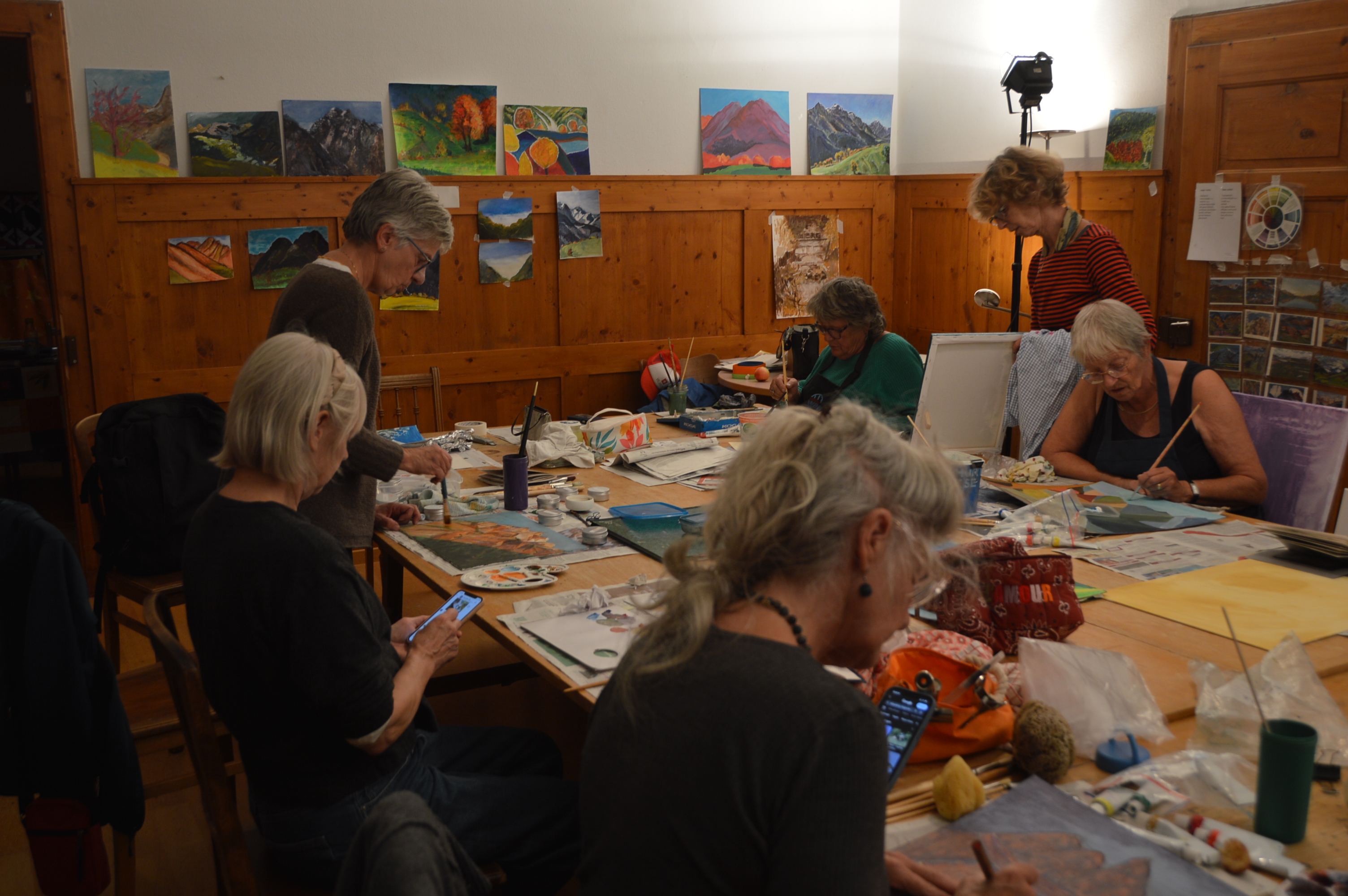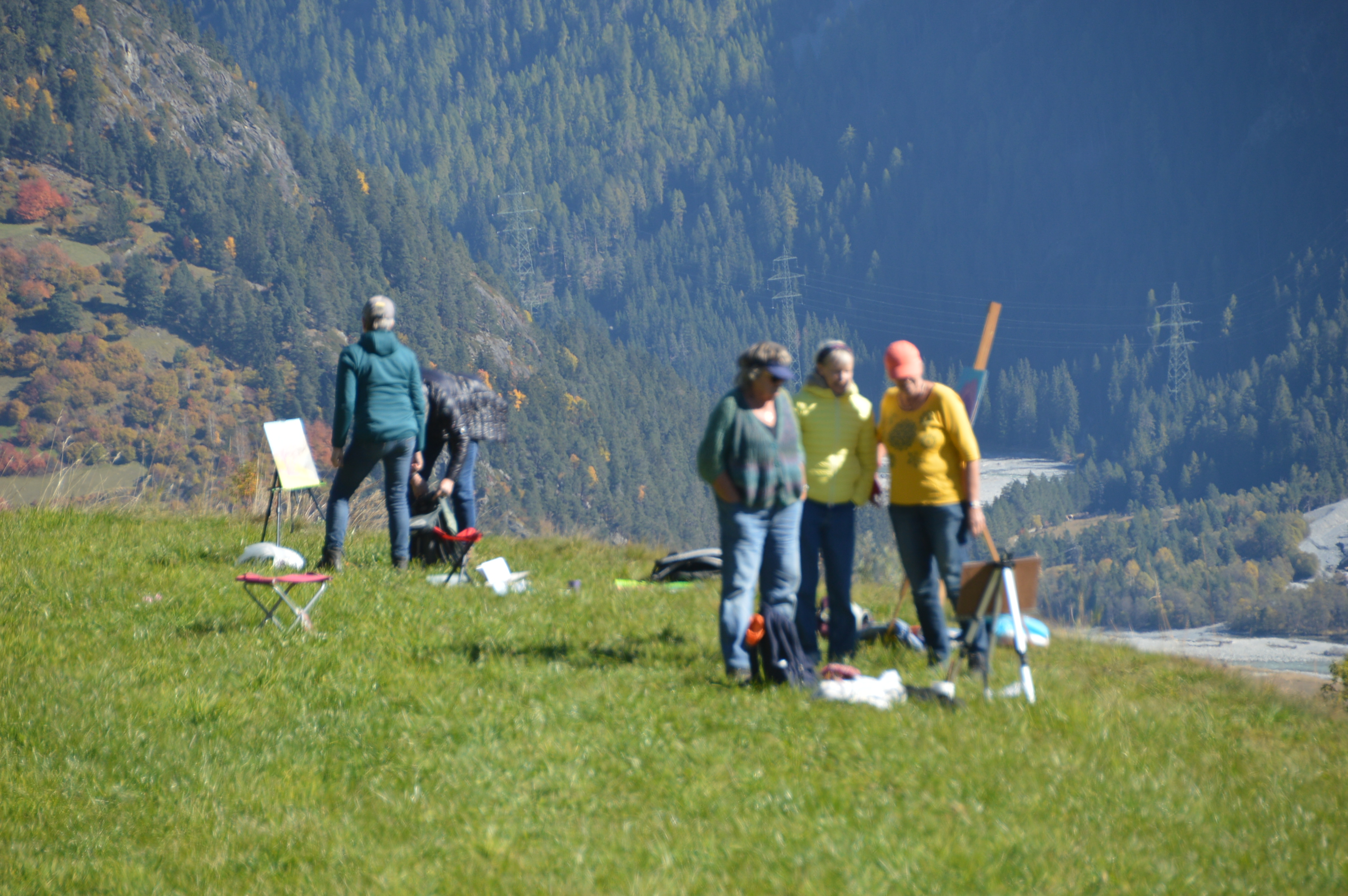 We maken impressies van de prachtige bergwereld. Al vanuit het hotel vinden we de mooiste plekken om ons te installeren. Op een half uurtje lopen zijn er nog meer mogelijkheden. Belangrijk is wel dat je de fysieke conditie hebt om dit te kunnen doen, houd er rekening mee dat de paden kunnen stijgen! In het hotel hebben we onze eigen studio tot onze beschikking, zodat we ook 's avonds kunnen werken en waar we met minder goed weer naartoe kunnen. Ik ben in het najaar een paar keer in Zwitserland geweest en het was altijd mooi weer.